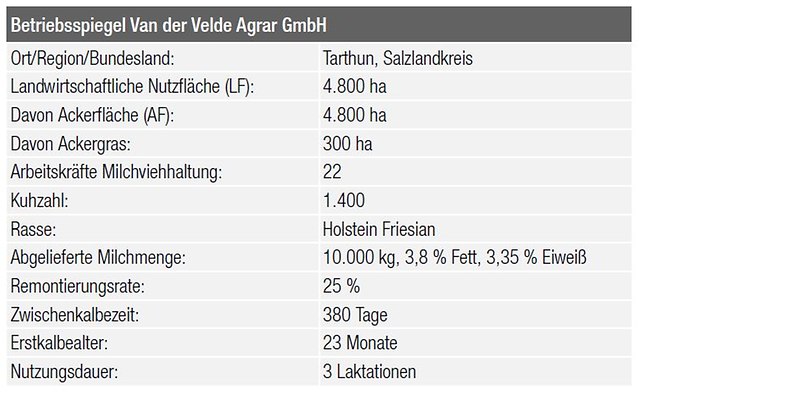 Außerdem hat Eike Holfeld beobachtet, dass die Kühe ihr Körpergewicht nach dem Abkalben besser halten können. Offenbar wird das Körperfett nicht mehr so stark abgebaut wie früher. Auch hier liegt die Erklärung darin, dass das energielose Stroh jetzt durch 350 g mehr Gras und 650 g SHREDLAGE® ersetzt wird, und dass den Kühen damit mehr energiereiches Grundfutter zur Verfügung steht. Auch die Kälber, die bis zum Alter von sechs Monaten die gleiche Mischung wie die Kühe bekommen, nehmen das neue Futter sehr gut auf und entwickeln sich stabiler als früher.